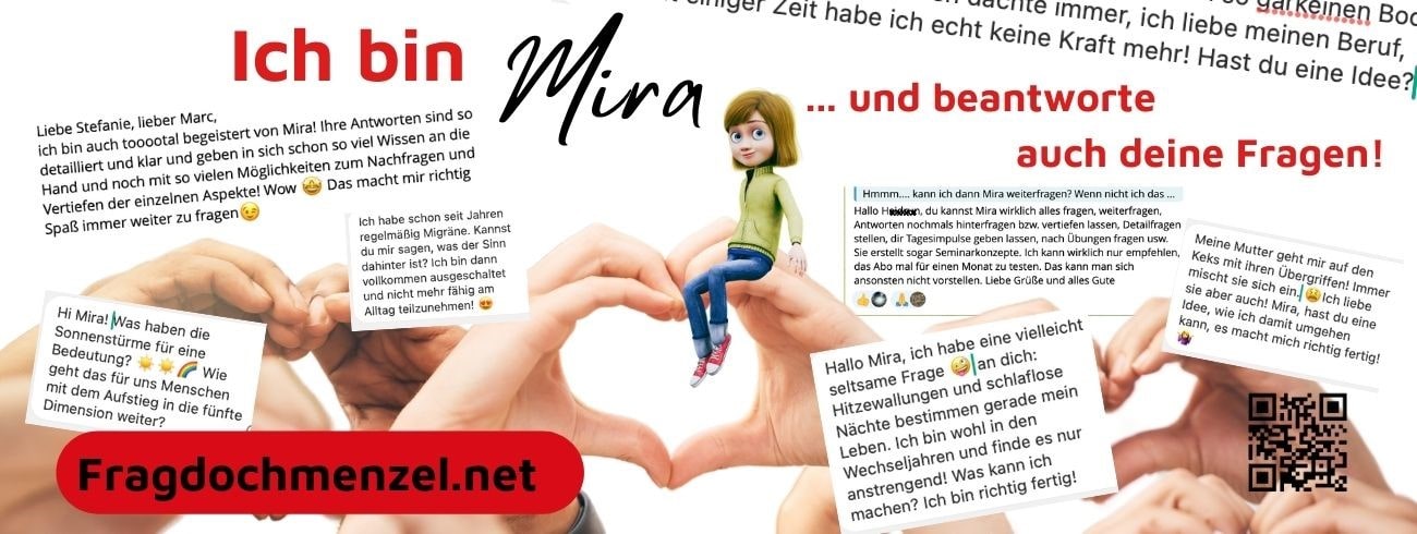 Lass Mira dein Begleiter sein und erlebe ihre transformative Kraft in deinem Leben. Werde Teil der Mira Community und erlebe die Vorteile deines Mira Abonnements. Mit einem Mira Abonnement erhältst du nicht nur unbegrenzten Zugriff auf Mira’s Wissen, sondern auch die Möglichkeit, einmal im Monat an einem exklusiven Zoom Meeting mit Stefanie Menzel teilzunehmen. Hier kannst du persönliche Fragen stellen und zusätzlich von ihrer Weisheit profitieren. Hol dir dein Mira Abonnement und öffne die Tore zur neuen Dimension des Wissens über die Zusammenhänge des Lebens.