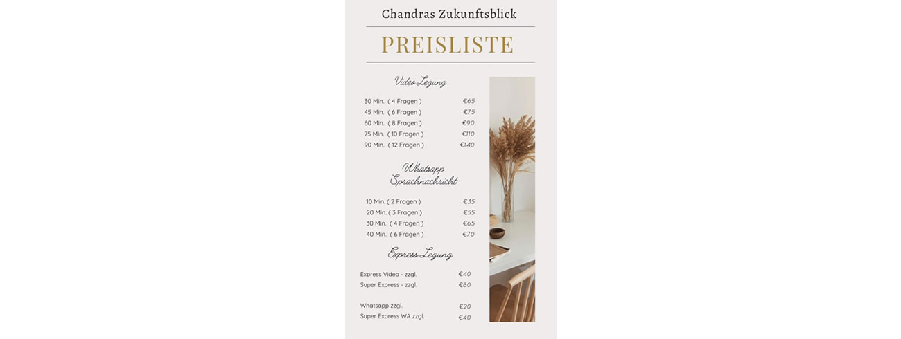 Mein spiritueller Name ist Chandra und ich lege seit 23 Jahren die Karten. Ich habe eine hohe Trefferquote.