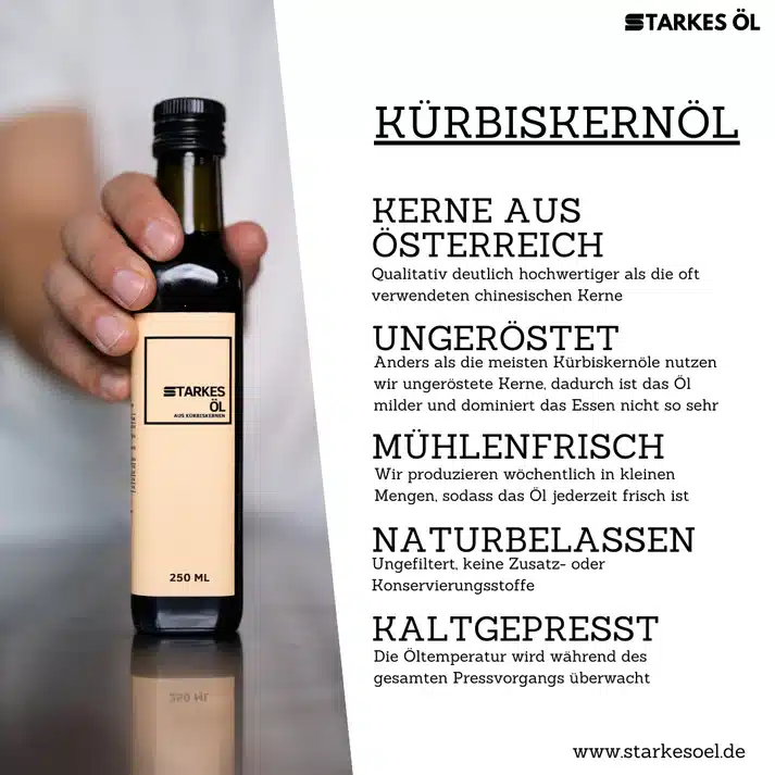 • Kürbiskernöl: Mit seinem intensiven, nussigen Aroma ist es ideal für herbstliche Suppen und Salate. Es fördert die Prostatagesundheit und unterstützt die Blasenfunktion.