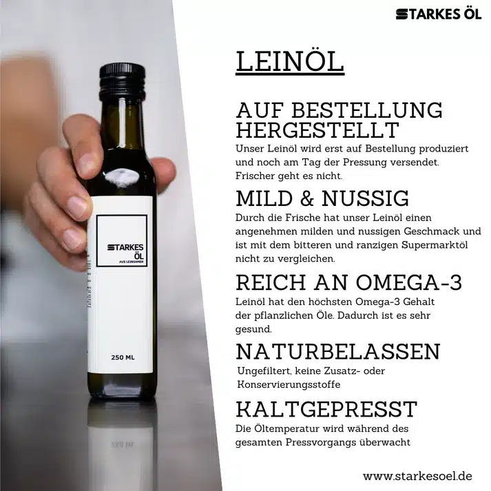 Hinweis zur Haltbarkeit: Besonders bei Leinöl ist die Frische entscheidend. Wir produzieren es erst auf Bestellung, damit es direkt aus der Presse auf deinen Teller kommt. Zur Verlängerung der Haltbarkeit empfiehlt es sich, das Öl im Kühlschrank zu lagern oder einzufrieren.