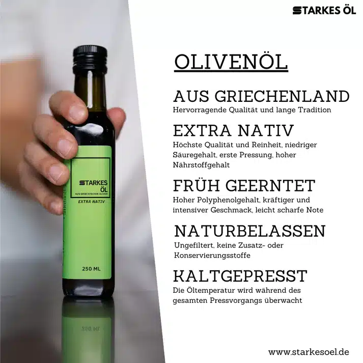 • Olivenöl: Perfekt für mediterrane Gerichte, Salate und Dressings. Es ist reich an gesunden Fetten und Antioxidantien, die gut für Herz und Haut sind.