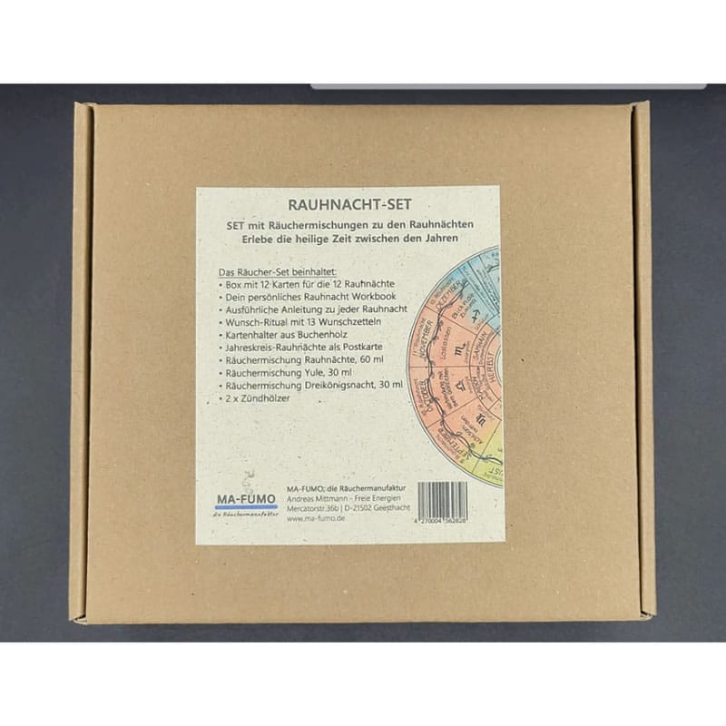 Unser Komplettset wurde speziell für die Rauhnächte gestaltet und enthält alles, was Sie benötigen, um diese besondere Zeit bewusst zu erleben. Die Box umfasst 12 Karten für die 12 Rauhnächte, eine ausführliche Anleitung, ein Wunsch-Ritual, ein Workbook sowie die passenden Räuchermischungen.
