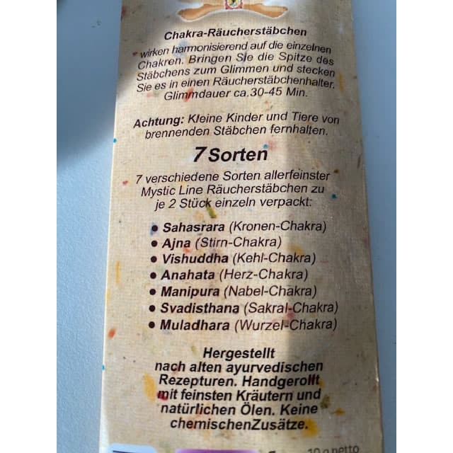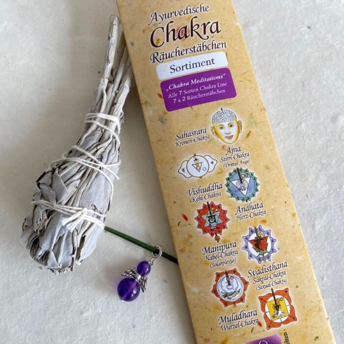 Dieses Set enthält je zwei Räucherstäbchen für jedes der sieben Chakren. Die speziell auf die Chakren abgestimmten Räucherstäbchen wirken ausgleichend und harmonisierend.